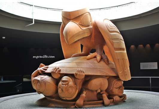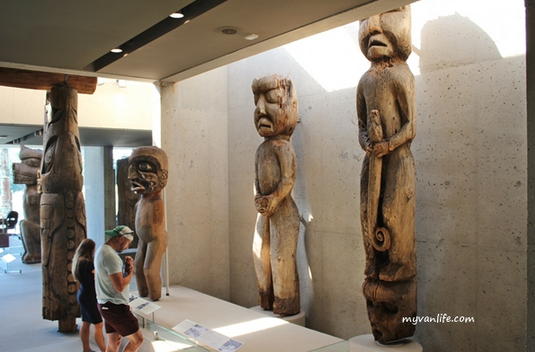 说到图腾柱数量和文化价值,温哥华人类学博物馆内(MOA)的图腾柱称冠加拿大,甚至北美大陆。位于卑诗大学校区内的MOA兼具观光和教学的功能:该校的美术、人类学、考古学、文物保护学和博物馆学的课程都在这里进行。馆内搜藏了38,000件全世界人种相关文物,以及535,000人类学的展品,西北岸第一民族部落、北极圈沿岸的因努特族以及现代原住民的艺术创作为大宗。