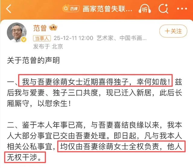 范曾在声明中先是自曝,【我和爱妻徐萌近期喜得独子,日后三口将在新居内长相厮守】。