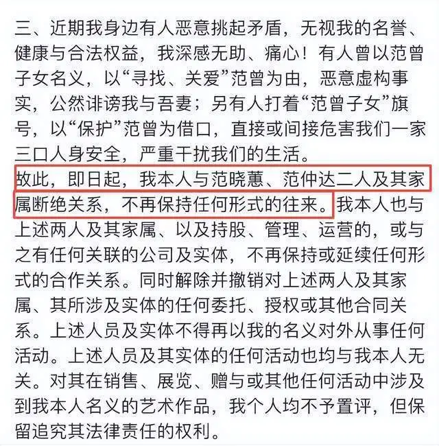 故,范曾官宣自此后将和范仲达、范晓蕙,以及他们的亲属断绝一切关系,未来不会保持任何形式的往来。