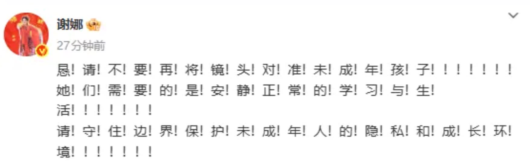 谢娜和张杰一向高度重视孩子的隐私,多年来从未让孩子正面曝光。相关视频流出后,谢娜罕见动怒,在社媒以一连串密集的感叹号怒斥:“恳!请!不!要!再!将!镜!头!对!准!未!成!年!孩!子!!!!!!!她!们!需!要!的!是!安!静!正!常!的!学!习!与!生!活!!!!!!!请!守!住!边!界!保!护!未!成!年!人!的!隐!私!和!成!长!环!境!!!!!!!”字里行间充满愤怒。