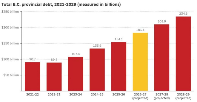 BC省的债务规模,正在用一种肉眼可见的速度往上蹿:从2025/26财年的1540亿,涨到2026/27年的1834亿;2027/28年破2000亿;到2028/29年,直接冲到2346亿加元。