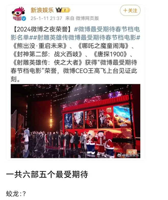 结果呢,微博之夜把五部电影列为“最受期待春节档电影”,给了五部电影主创上台推介电影的机会,唯独《星河入梦》一部缺席。